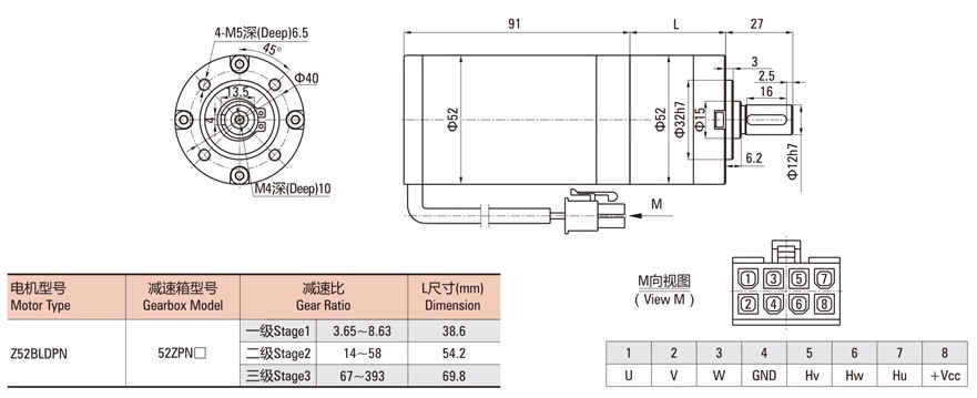 外徑52直流無刷行星減速電機(jī)外形圖: