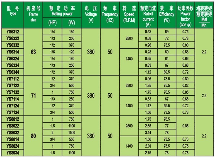 機座號:63~90 功率:1/4~10HP(0.18~1.1KW) 電壓:220/380V 頻率:50/60Hz